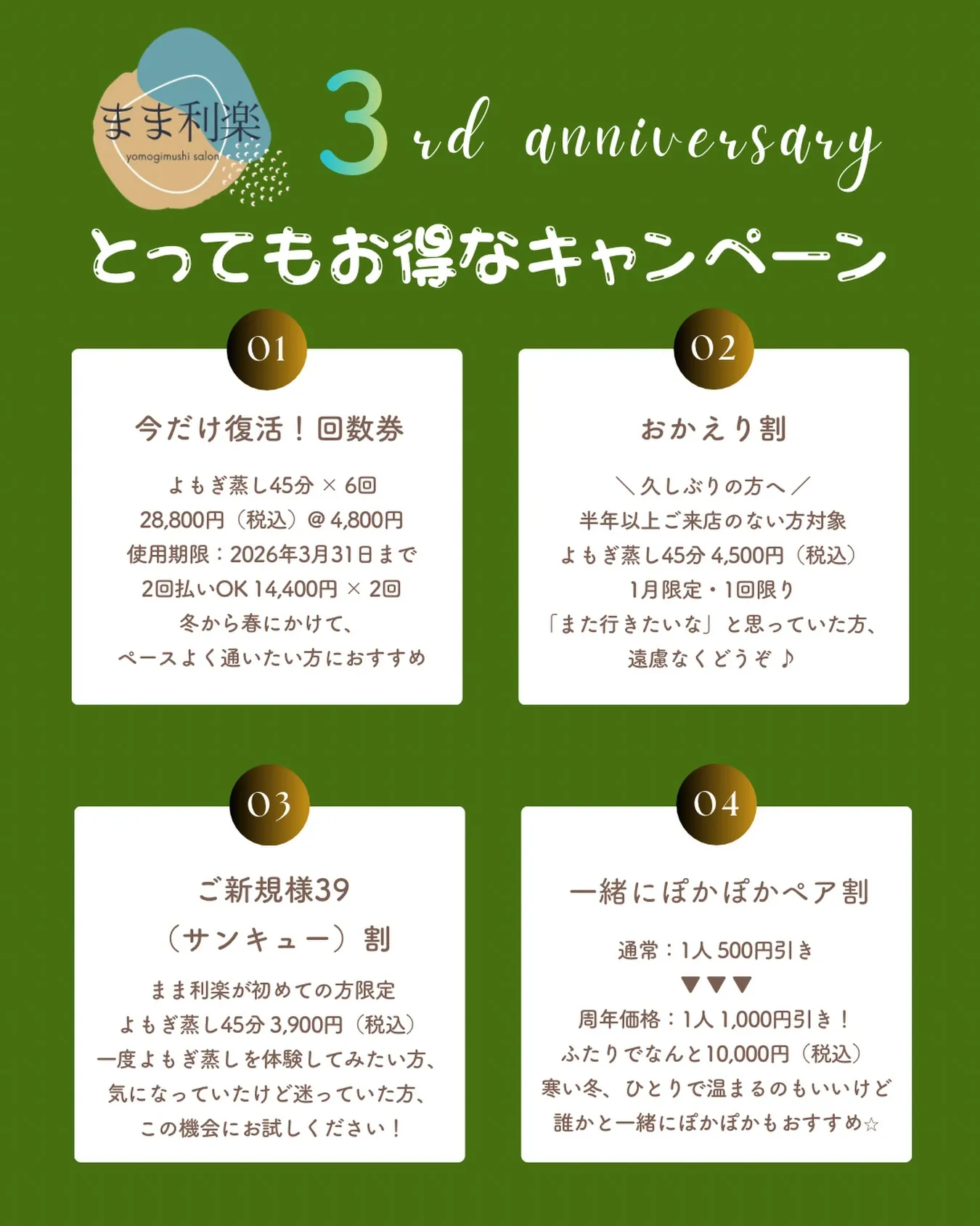 🌿まま利楽 3rd anniversary🌿 🌿まま利楽3rdanniversary🌿あけましておめでとうございます!おかげさまで、まま利楽は1/5に3周年を迎えます。いつも通ってくださる皆さま、気にかけてくださる皆さま、本当にありがとうございます。よも…